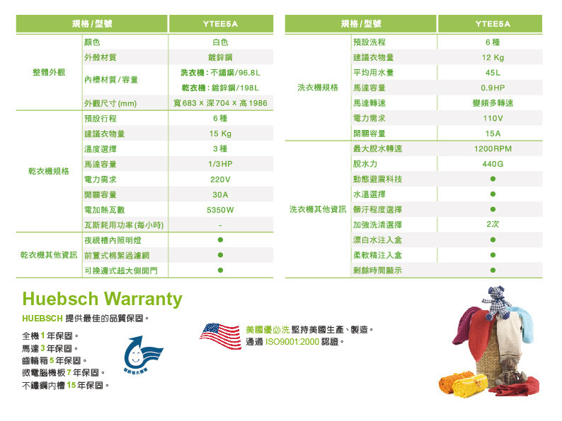 | 內槽材質/容量 | 洗衣機:不鏽鋼/96.8L 乾衣機:鍍鋅鋼/198L |